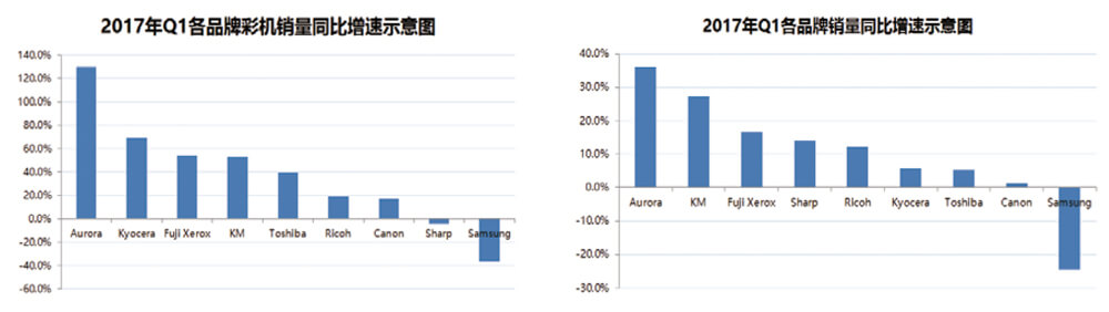 上图是各品牌2017年Q1销量同比增速示意图,可见随着市场回暖,大部分复印机品牌市场销量均呈现正向增长,尤其是Aurora震旦品牌继续行业领跑,销量增速更高达30%以上,冠压群雄,展现了中华民族品牌的强大实力。